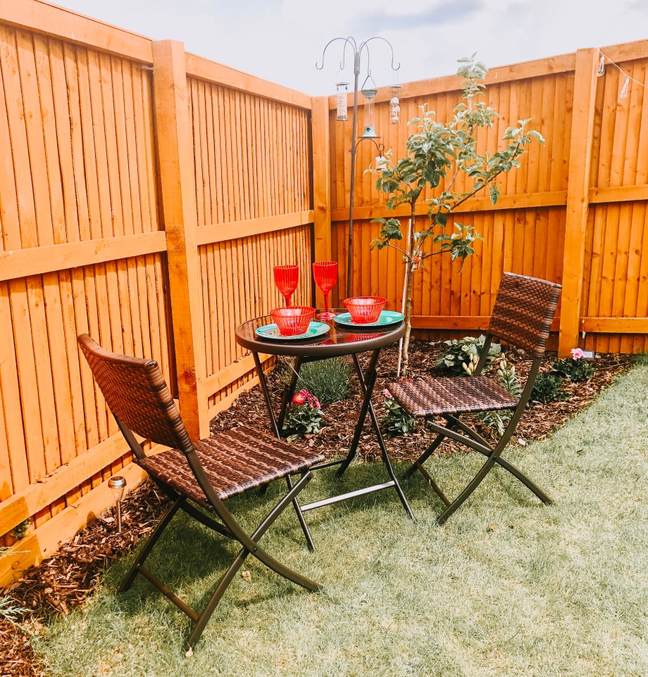 It has a glass top table that is easy to wipe down and the chairs are surprisingly comfy for outdoor furniture. Even Finn thinks so!